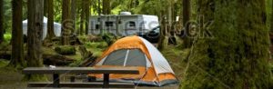 stock-photo-the-campground-small-orange-tent-and-travel-trailer-in-the-background-deep-forest-campground-109597442
